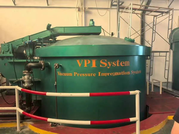 Our vacuum pressure impregnation (VPI) process involves pre-baking the workpiece to remove moisture, then cooling it down before placing it in a vacuum vessel to evacuate air and volatile substances from inside the bare coil. Under vacuum, the impregnating varnish or resin is drawn in by gravity and capillary action. After the vacuum stage, dried compressed air or an inert gas is applied under pressure to force the varnish to rapidly penetrate and fill the deeper layers of the insulation structure.